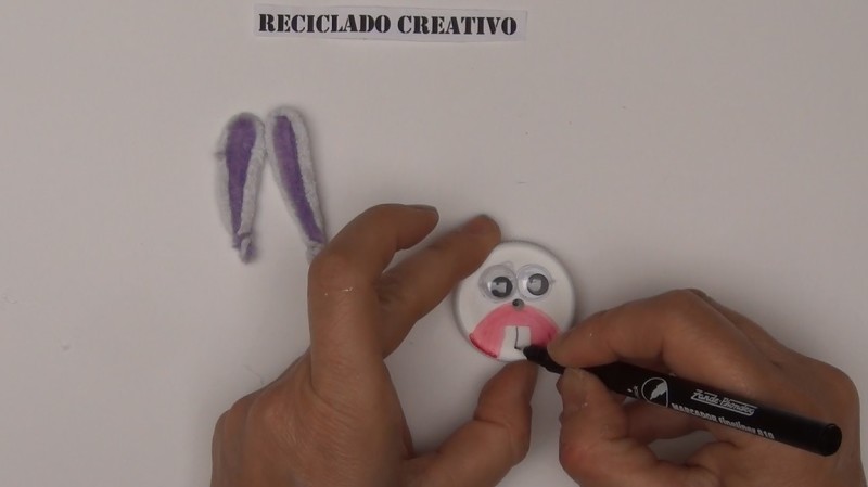 Manualidad para niños. Un conejo hecho reciclando un tapón de botellas de plástico.