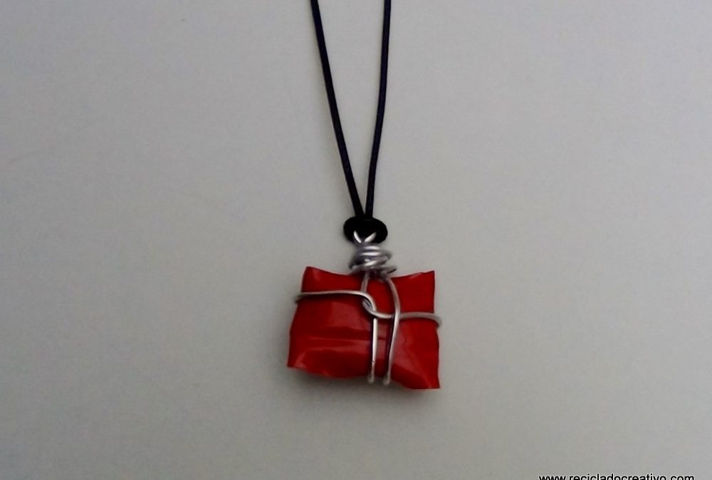 Bisutería: colgantes, pendientes y anillos de color rojo realizados con una botella de plástico