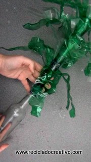 Están hechas con botellas de plástico pet de color verde. Utilizando la parte superior, y quitando la base. Uniendo varias botellas por la parte superior. Para hacer esta decoración más útil, he aprovechado la rosca para hacerla compatible con otras botellas. De ese modo se puede cambiar la base del florero utilizando botellas de otros colores o materiales, y añadiendo las hojas verdes decorativas.
