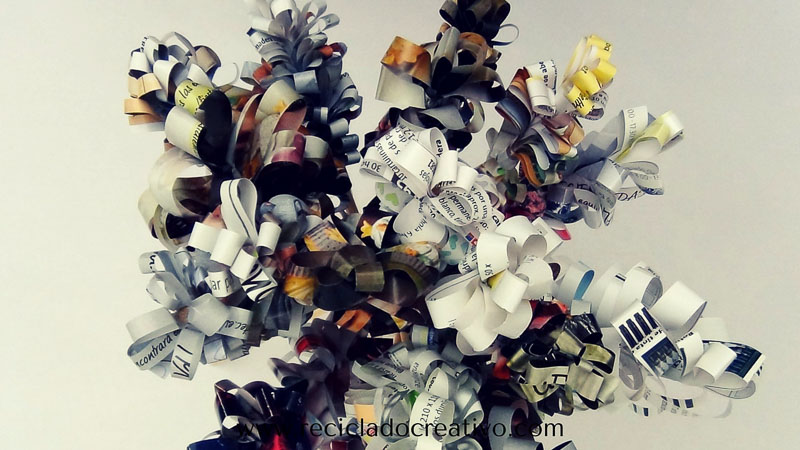 Flores de papel reto reciclado creativo con hojas de revistas.