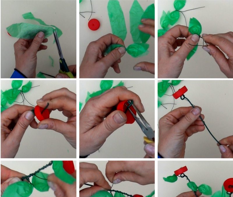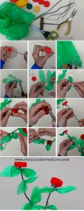 Flores hechas con tapones de botellas y bolsas de plástico.