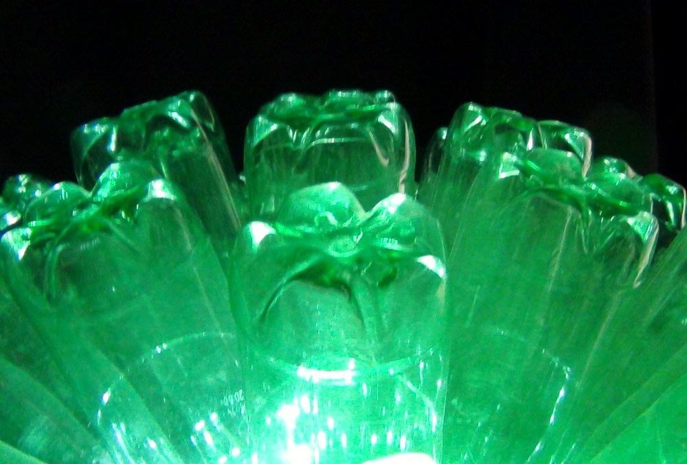 Lámpara realizada con 125 botellas de plástico recicladas de color verde