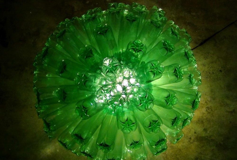 Lámpara realizada con 125 botellas de plástico recicladas de color verde
