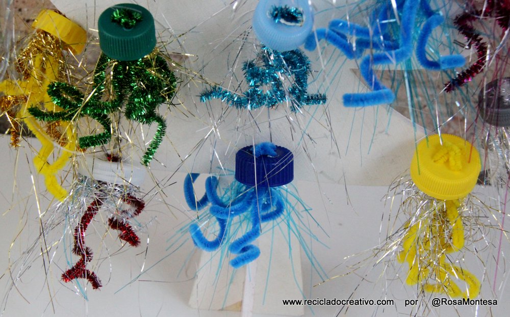 Medusas hechas con tapones de botellas de plástico recicladas