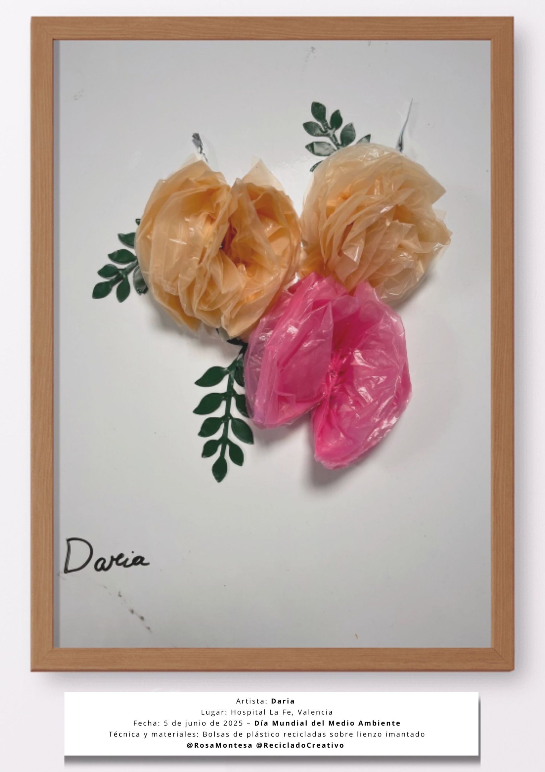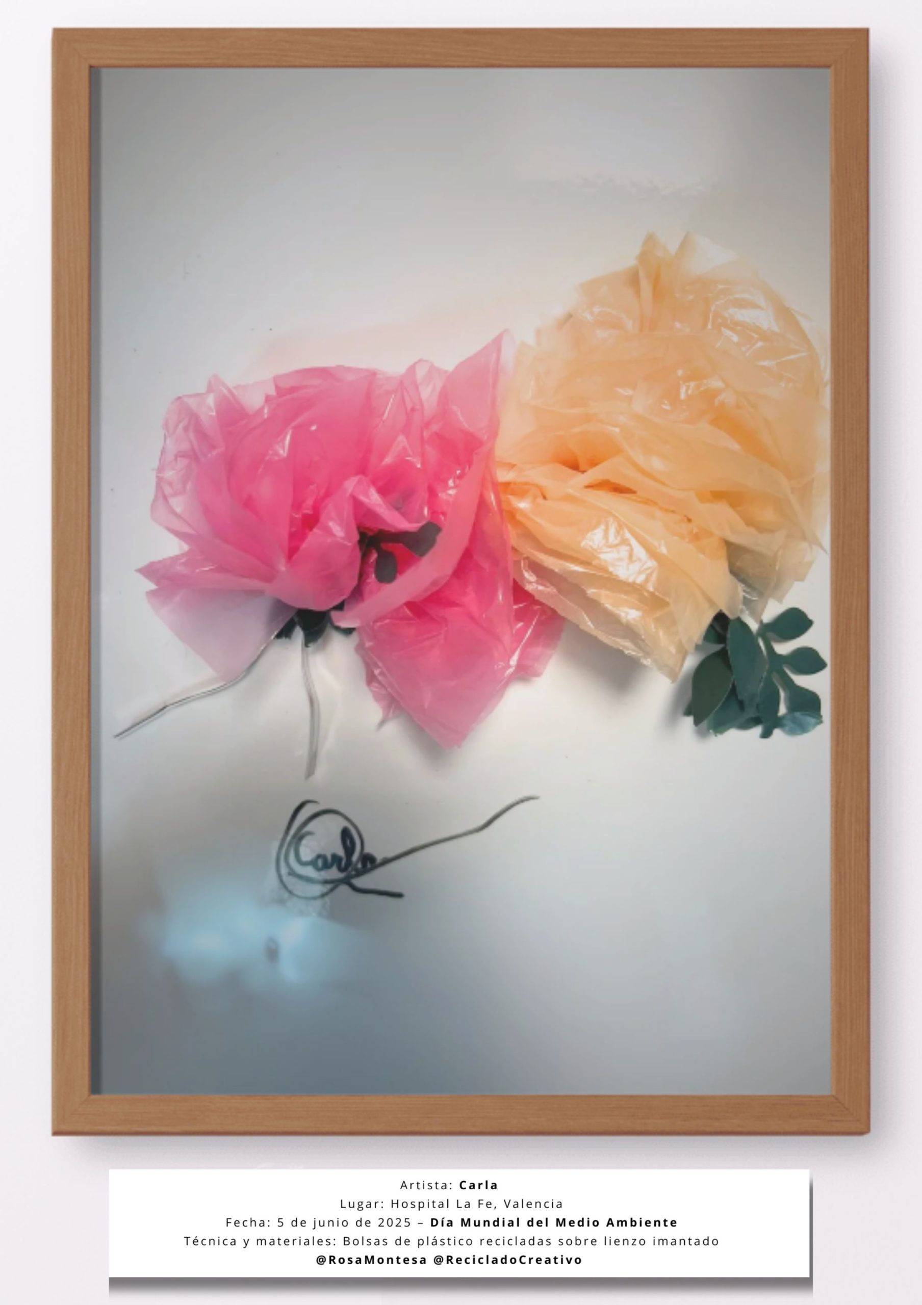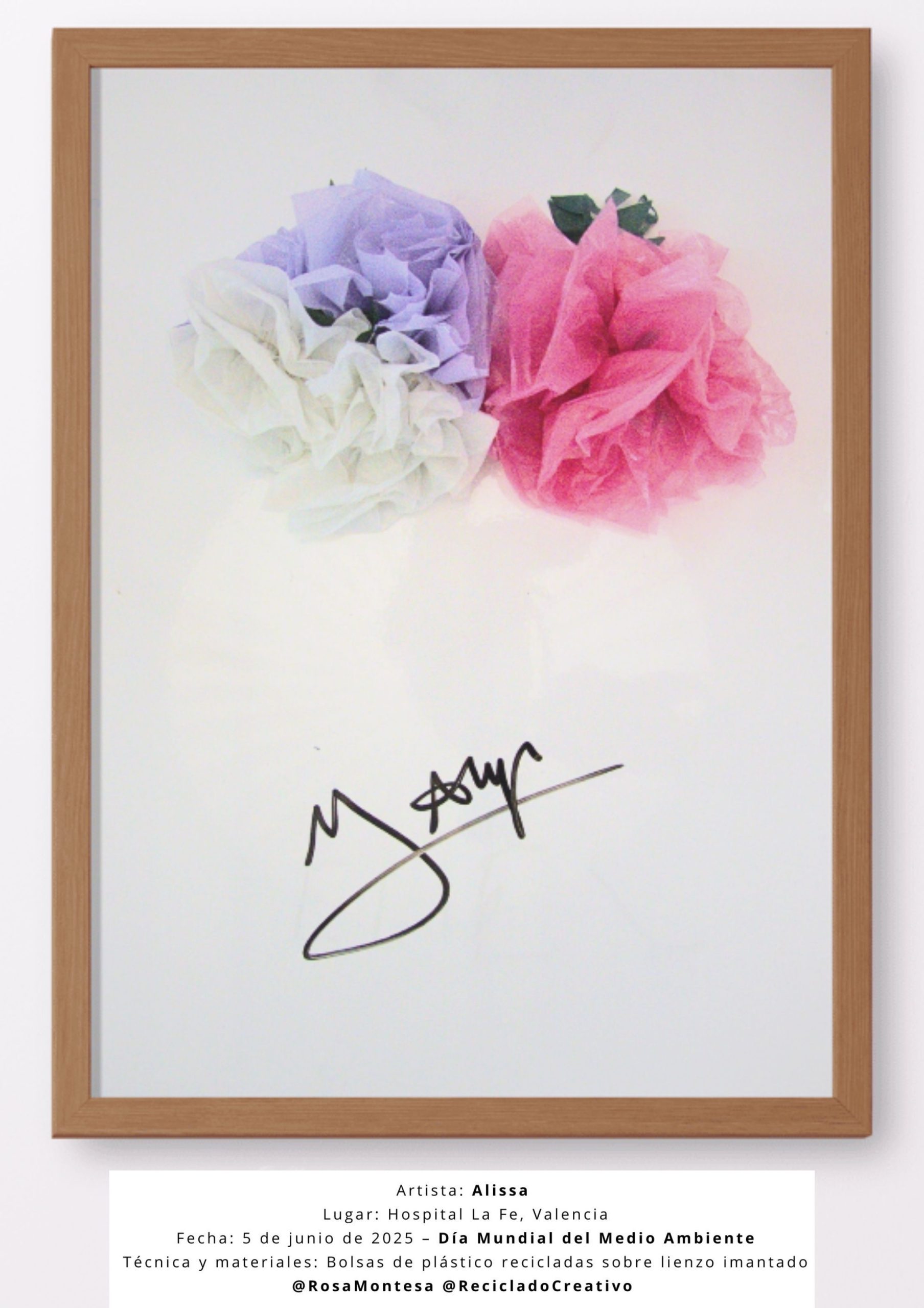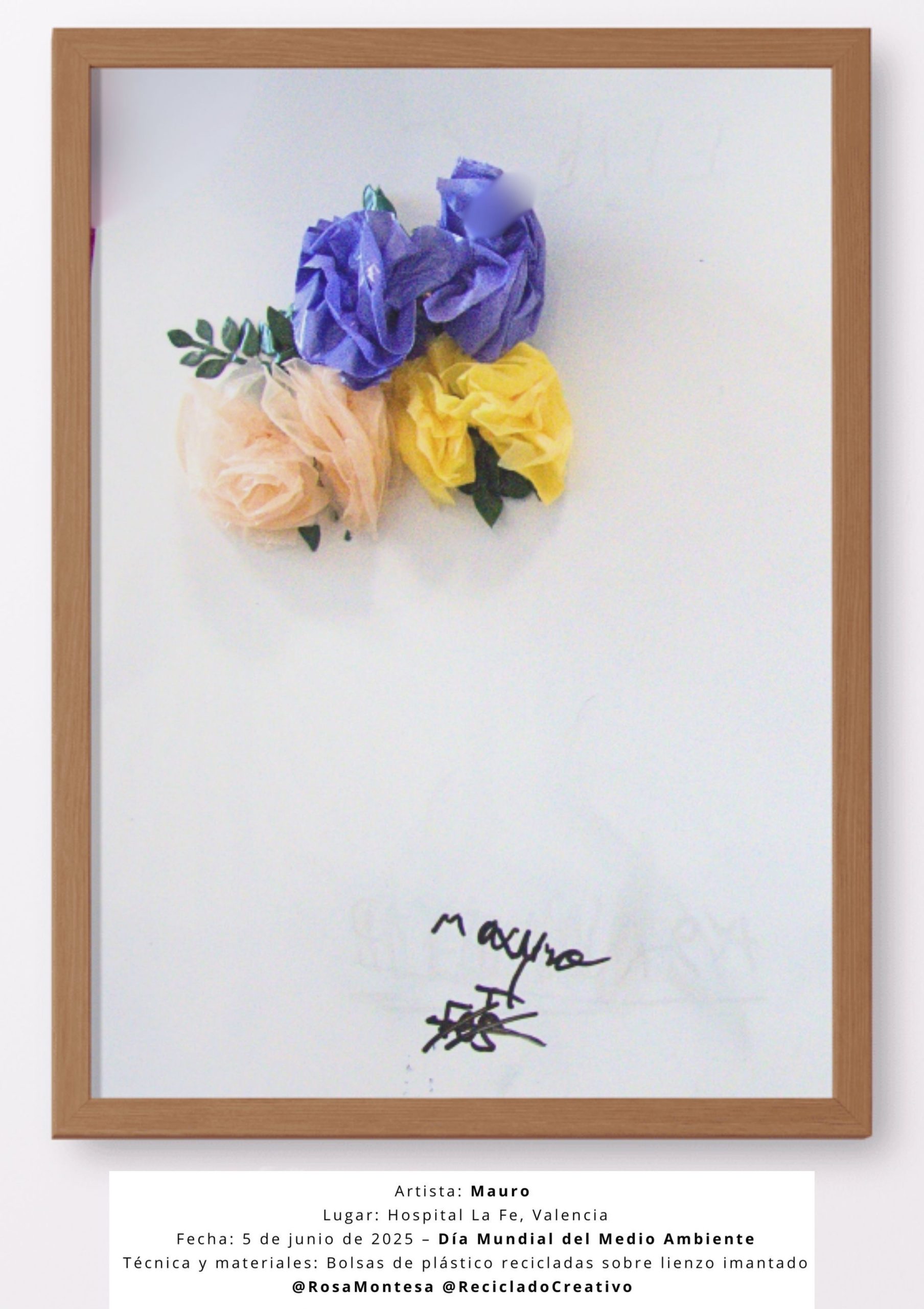 Los talleres ofrecieron una experiencia artística completa adaptada a todas las edades y habilidades. En un ambiente seguro, alegre y cuidadosamente preparado, los niños transformaron bolsas de plástico recicladas en flores llenas de color y expresión. Acompañados por las profesoras del aula hospitalaria y con el apoyo de Rosa Montesa, los participantes desarrollaron composiciones únicas que pudieron firmar como artistas y fotografiar antes de desmontarlas o llevárselas consigo.